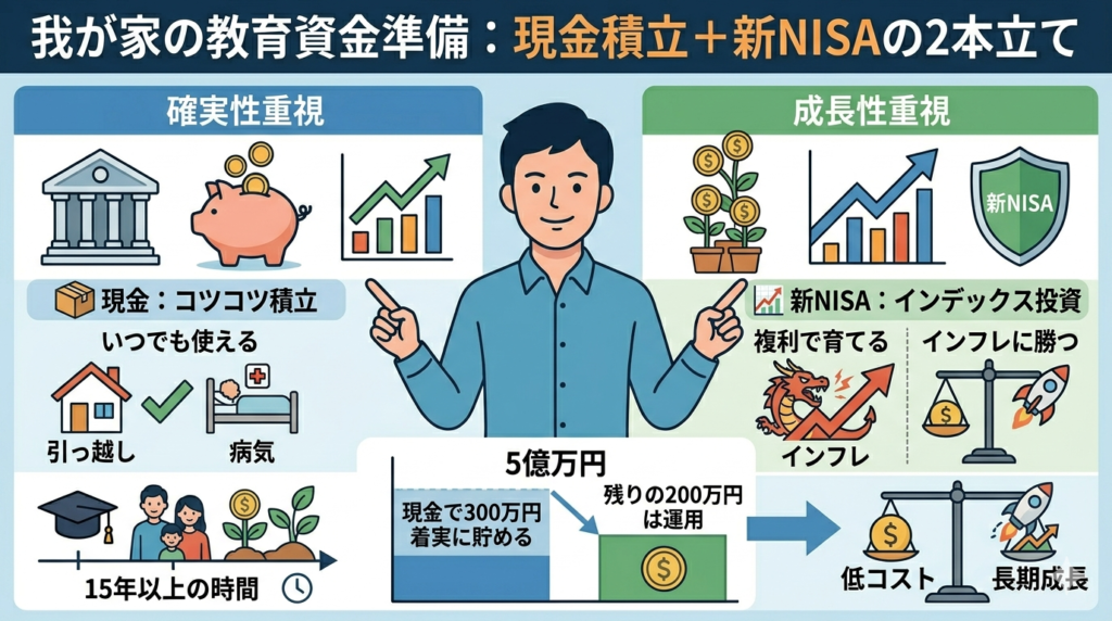 結論から言うと、教育資金の準備は「現金の積立」と「新NISAでのインデックス投資」の2本立てが基本方針です。