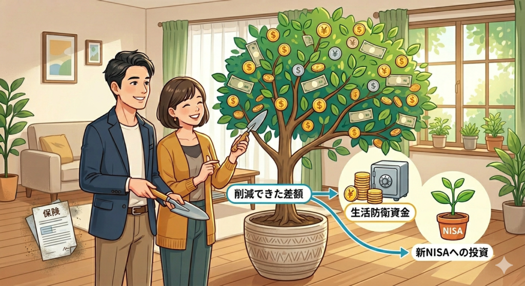 削減できた差額は、生活防衛資金の上乗せと新NISAへの投資に回しています。保険を適正化することで、浮いたお金が「お金のなる木」を育てる資金になります。