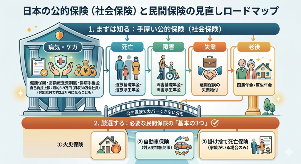 日本の公的保険(社会保険)は、実はとても手厚い仕組みです。民間保険を検討する前に、まず公的保険でどこまでカバーできるかを確認することが重要です。